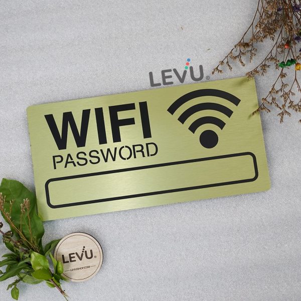 Bảng aluminium nhôm xước ghi thông tin wifi trang trí quán mẫu LEVU-ALU02 ưu tiên hiển thị rõ nét thực dụng với phần chữ font dễ đọc cùng với thiết kế phần thông tin pass có nhiều khoảng trống để điền chữ lớn hơn. Phần trên cũng được lược bớt đi ô network để nội dung hiển thị tối ưu hơn.