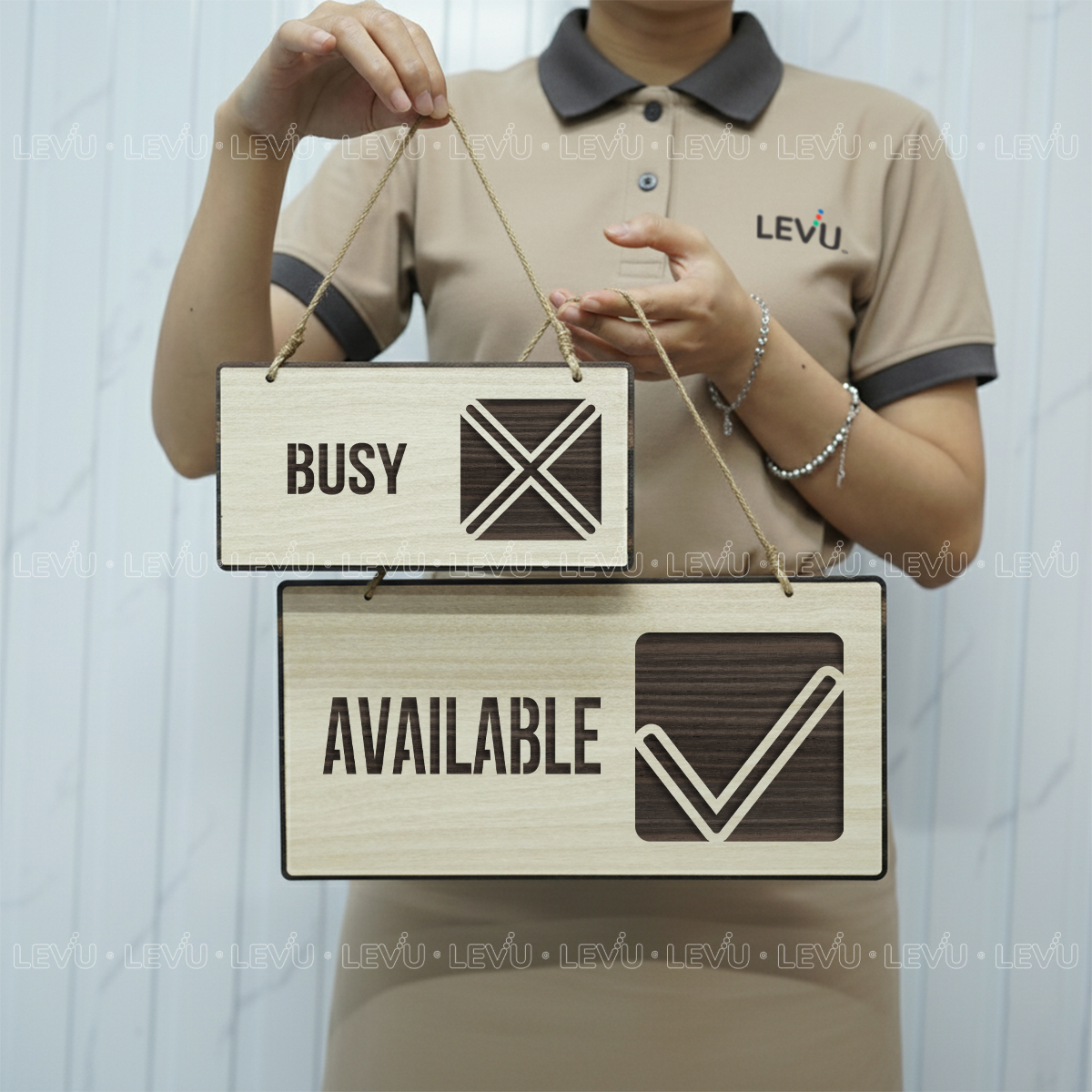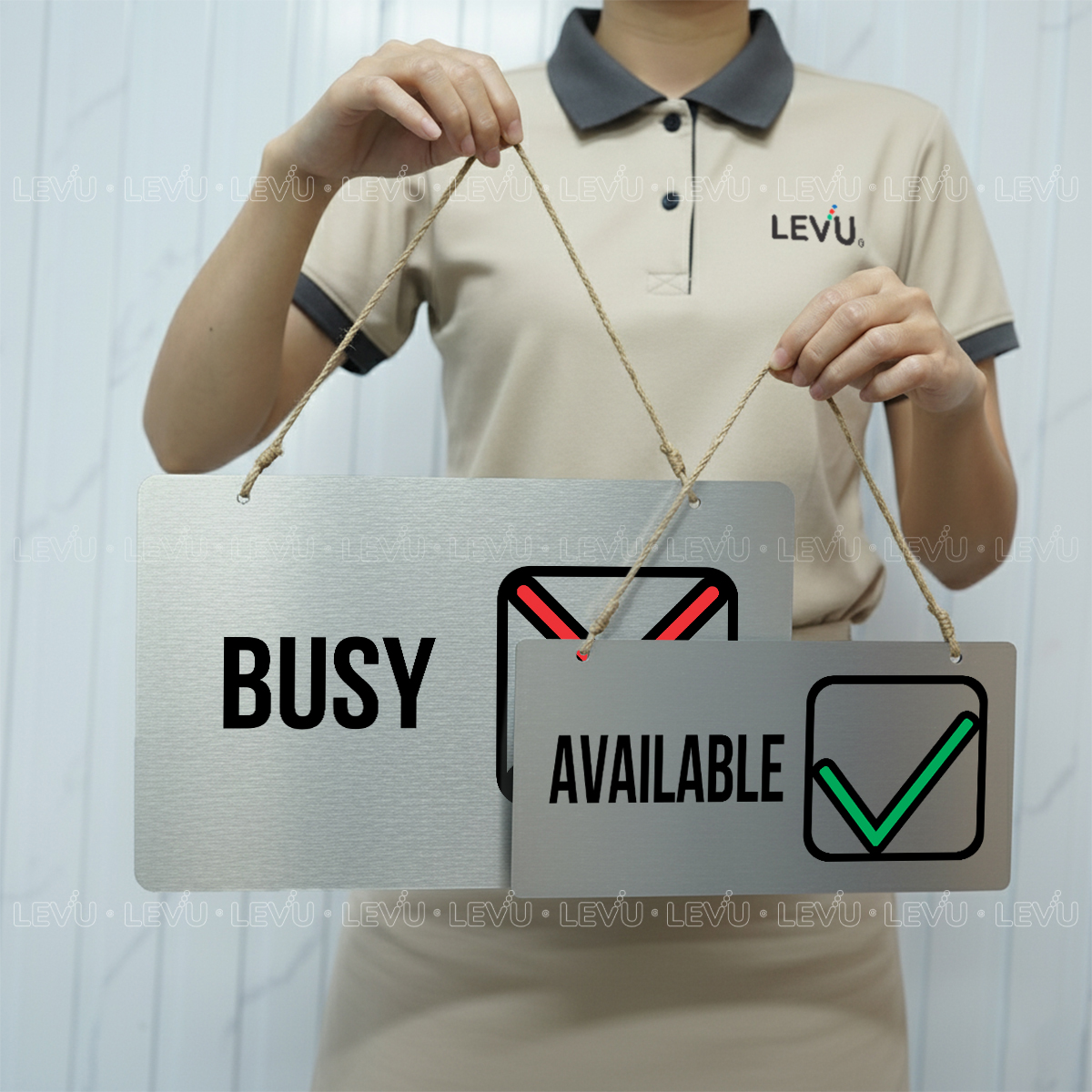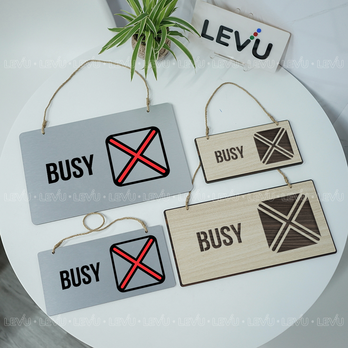 Bảng hiệu treo cửa trang trí 2 mặt Busy / Available LEVU BG70 là giải pháp thông minh giúp bạn truyền tải trạng thái làm việc một cách tinh tế và chuyên nghiệp. Sản phẩm được gia công trực tiếp tại xưởng LEVUShop mang đến lựa chọn đa dạng về chất liệu và kích thước, phù hợp cho văn phòng, studio, hay không gian làm việc tại nhà.