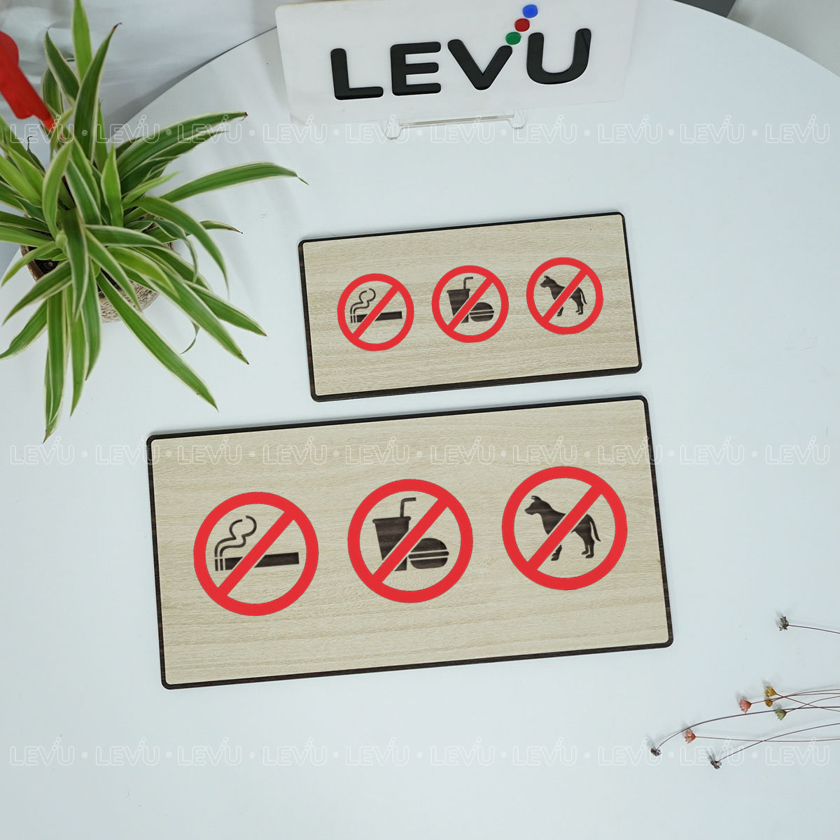 Biển cấm thú cưng, cấm mang đồ ăn, cấm hút thuốc trang trí quán LEVU BG88 chất liệu gỗ khắc laser
