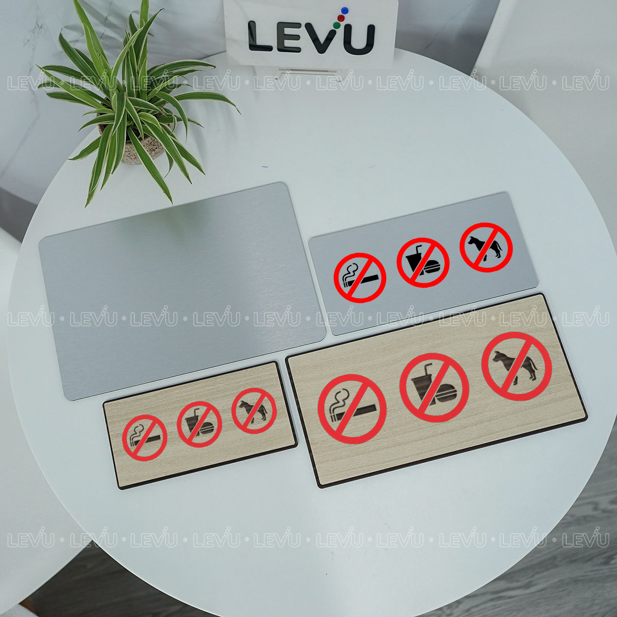 Biển cấm thú cưng, cấm mang đồ ăn, cấm hút thuốc trang trí quán LEVU BG88 chất liệu alu in uv