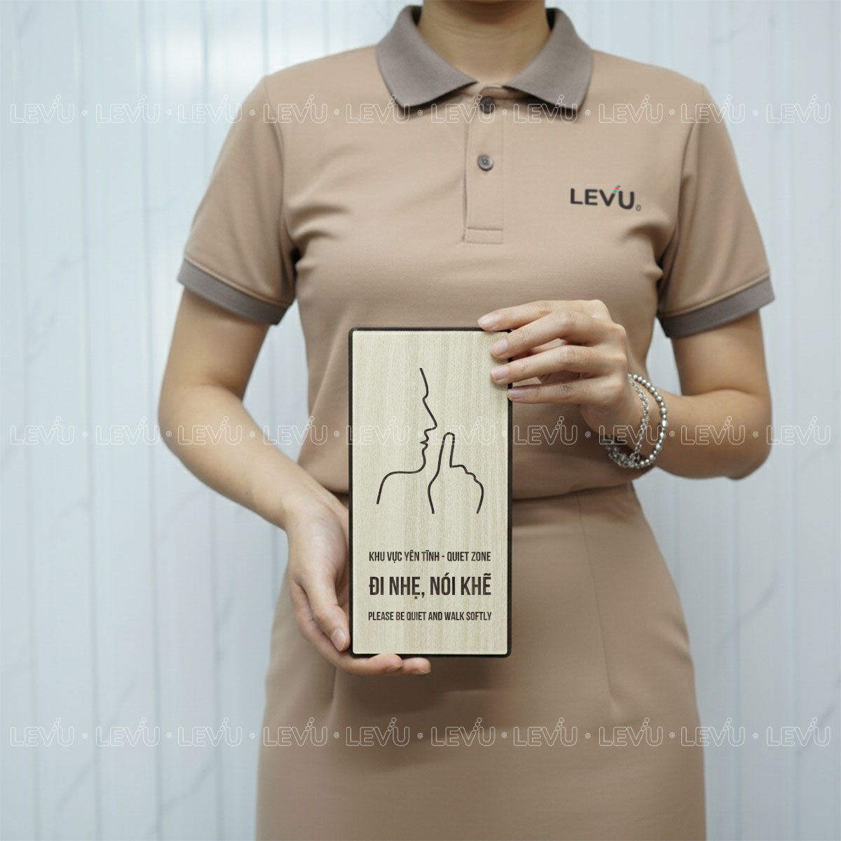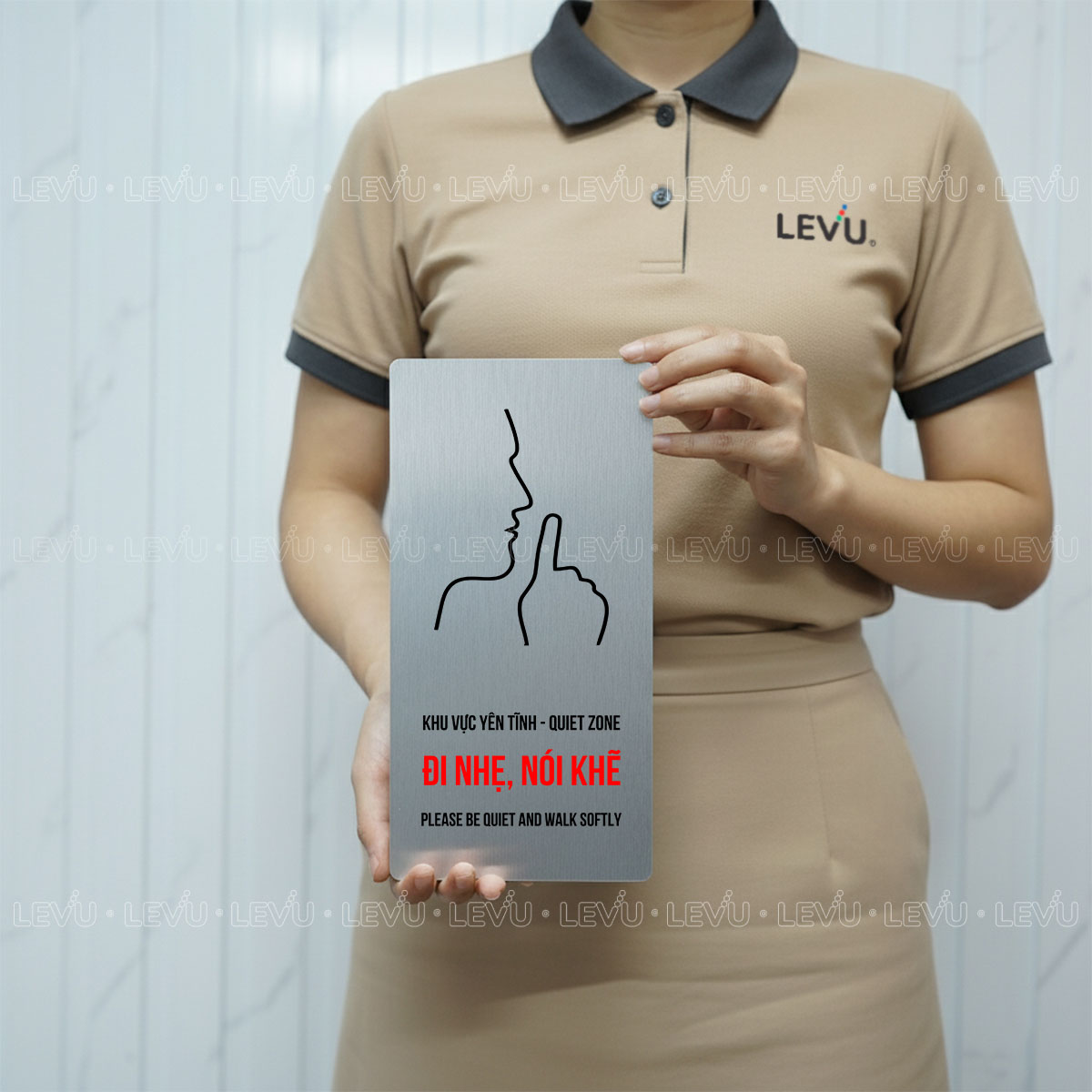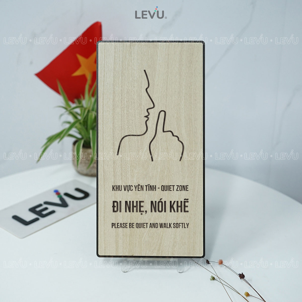 Biển dán tường vui lòng giữ im lặng trang trí cửa phòng LEVU BG82 là giải pháp tinh tế giúp duy trì không gian yên tĩnh và chuyên nghiệp. Với thiết kế tối giản, thông điệp song ngữ rõ ràng và hai tùy chọn chất liệu cao cấp là gỗ MDF và nhôm Alu, sản phẩm phù hợp cho văn phòng, spa, thư viện hay các khu vực cần sự tập trung.