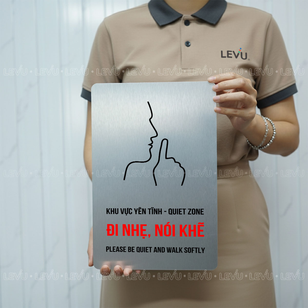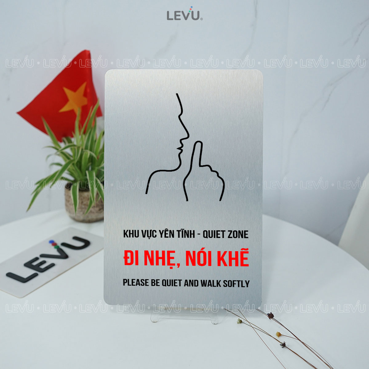 • Nội dung: “vui lòng giữ im lặng” quốc tế cùng dòng chữ song ngữ “KHU VỰC YÊN TĨNH – QUIET ZONE / ĐI NHẸ, NÓI KHẼ – PLEASE BE QUIET AND WALK SOFTLY”.