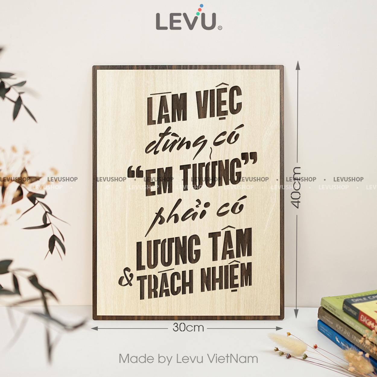 Tranh slogan giá rẻ LEVU002 “Làm việc đừng có em tưởng, phải có lương tâm và trách nhiệm” bằng gỗ tạo động lực. Tranh slogan giá rẻ hiện đại phong cách mới. #tranhslogan #levu