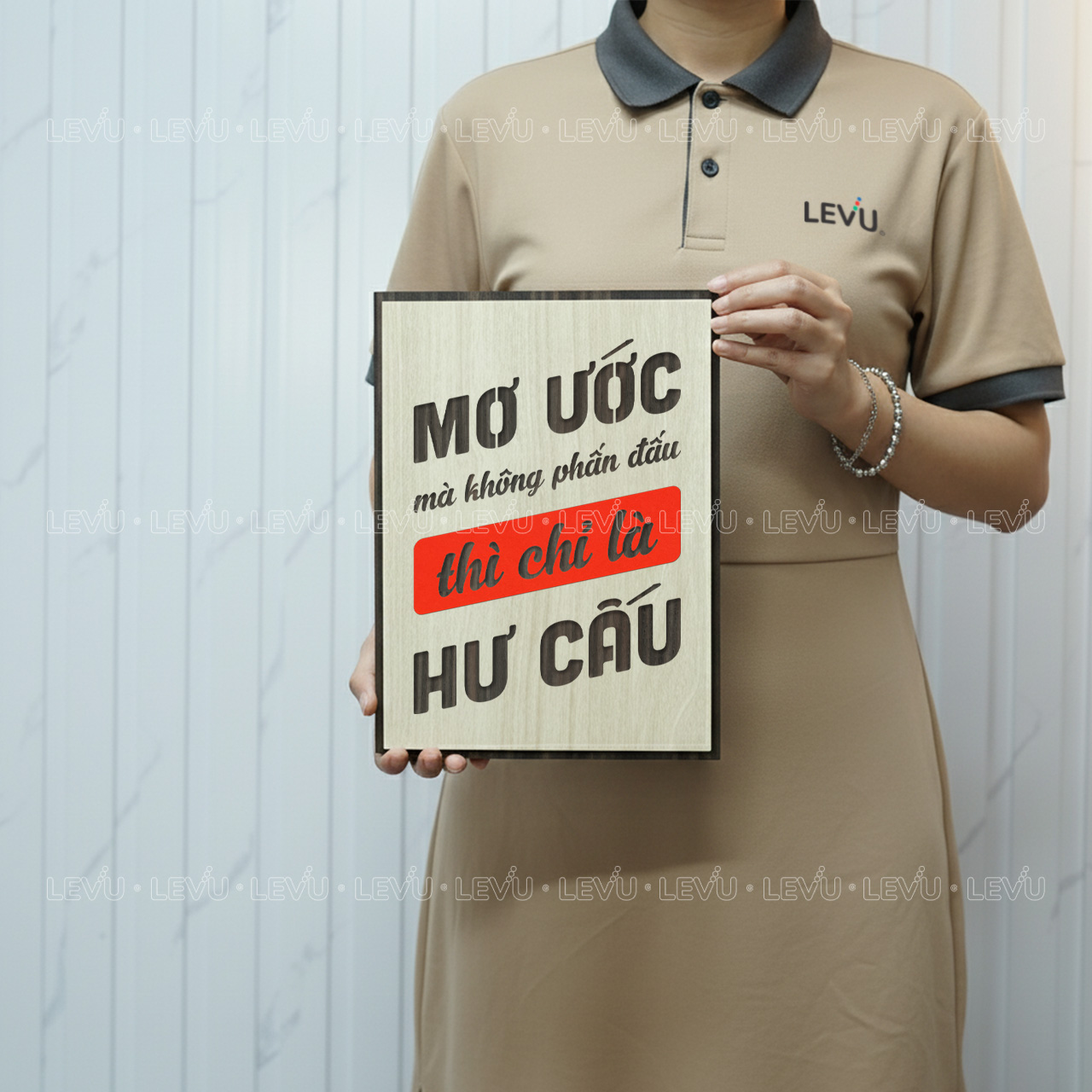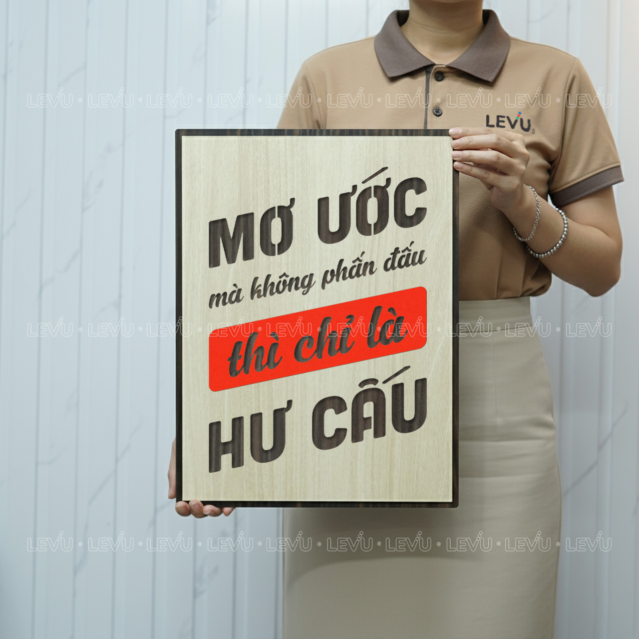 Tranh Slogan khẩu hiệu LEVU116 “Mơ ước mà không phấn đấu thì chỉ là hư cấu” là sự kết hợp hài hòa giữa chất liệu gỗ thân thiện môi trường và công nghệ khác laser hiện đại, mang đến một sản phẩm đáp ứng nhu cầu về cả mặt hình ảnh lẫn thông điệp nội dung muốn truyền tải. Tranh dùng treo tường với móc treo được gắn sẵn phía sau, đảm bảo cho việc lắp đặt và di chuyển dễ dàng.