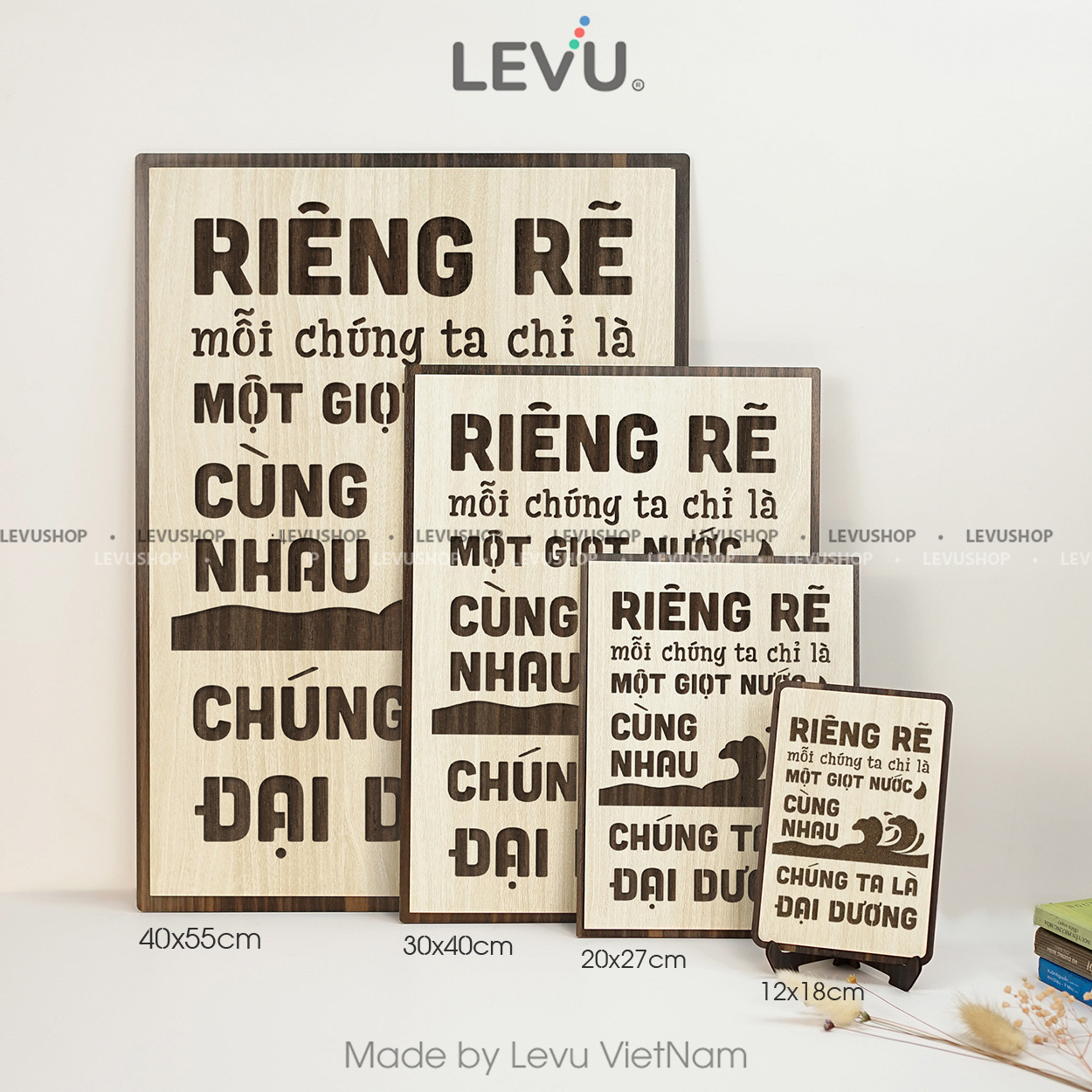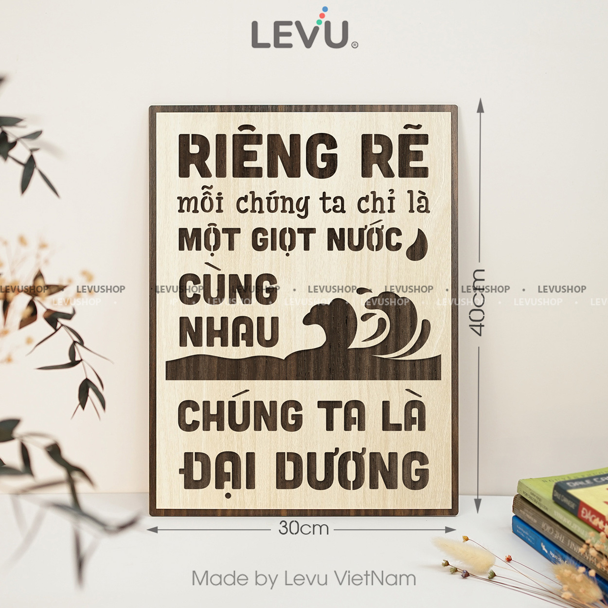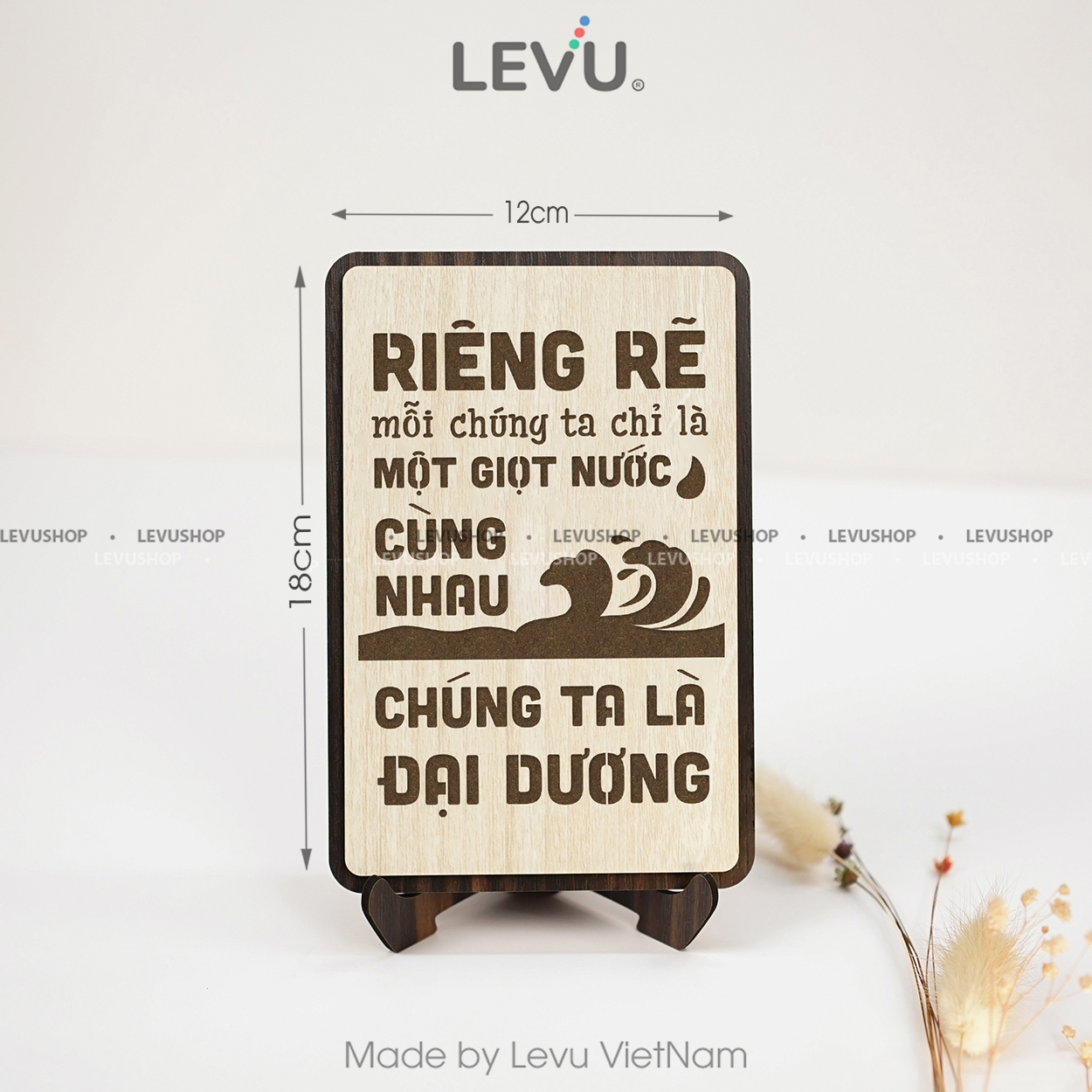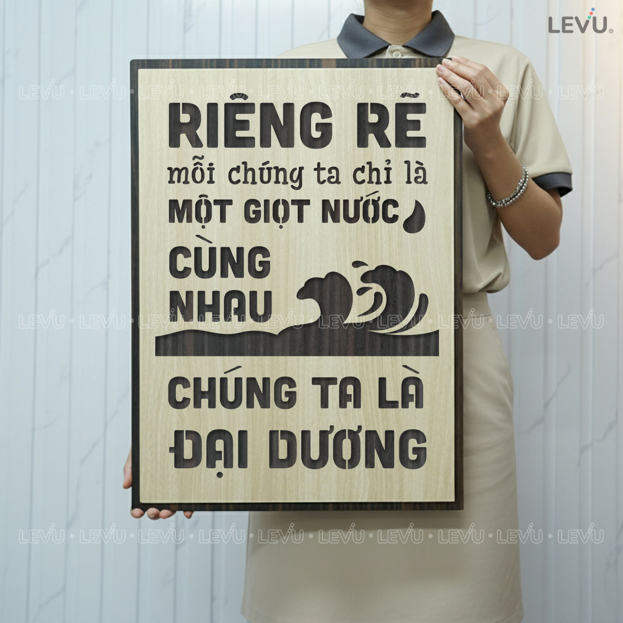 Tranh slogan LEVU115 “Riêng rẽ mỗi chúng ta chỉ là một giọt nước, cùng nhau chúng ta là đại dương” sử dụng phương pháp khắc laser 3d chìm trên nền gỗ mdf cao cấp nên sẽ tạo ra những đường sắc nét, tạo ấn tượng cho người nhìn cũng như làm tổng thể bức tranh trở nên ấn tượng hơn. Sản phẩm có thể dùng để đặt bàn hoặc treo tường bằng móc treo và đinh 3 chân đã gắn sẵn.
