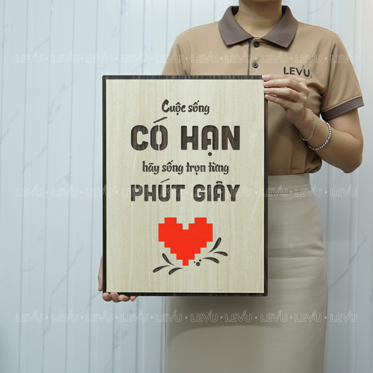 Tranh treo tường gỗ LEVU036 “Cuộc sống có hạn hãy sống trọn từng phút giây” thuộc mẫu tranh khắc kỹ thuật được gia công tỷ mỷ và có tính hoàn thiện tốt. Sản phẩm bao gồm phần nội dung và hình ảnh được sắp xếp hợp lý để tạo nên một bố cục hài hòa, cân đối, giúp người xem dễ hiểu và dễ tiếp cận.